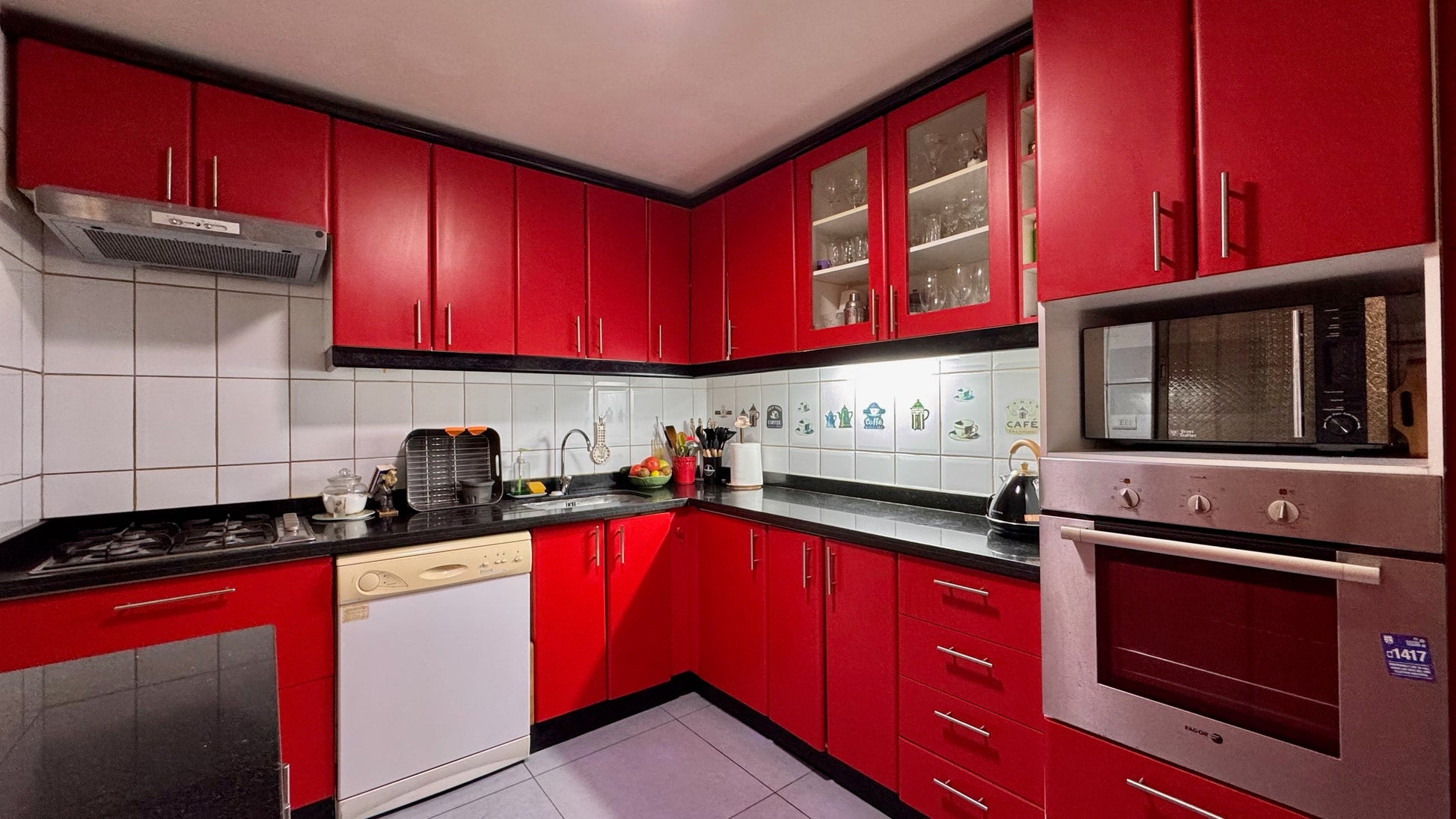 cocina equipada con horno empotrado, encimera y campana